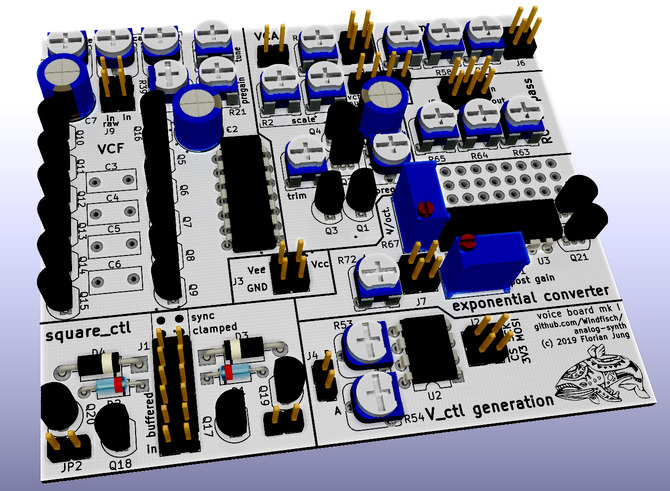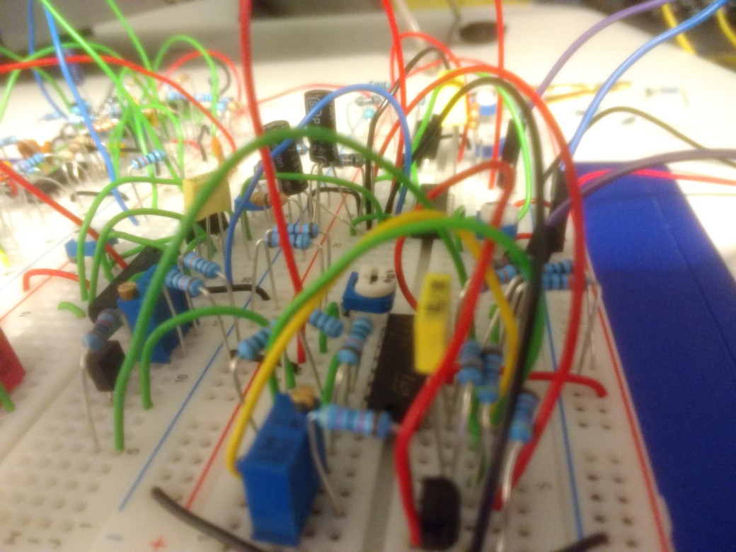 I have a working synthesizer with 2 VCOs, a filter and a VCA. It has enough MIDI support to be played, but suffers from noise and hum. This is yet to be debugged.